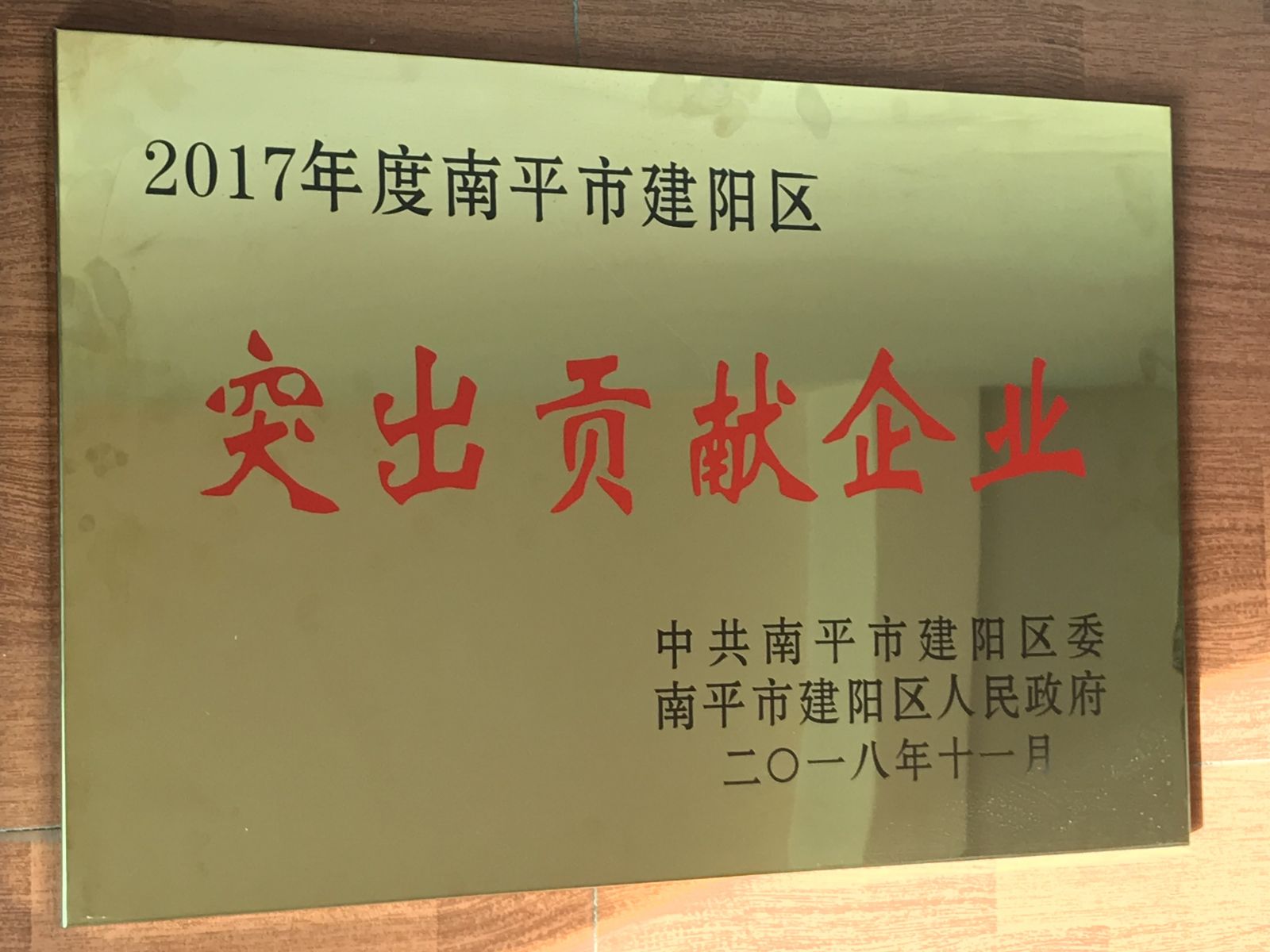 2018年11月22日下午,建陽(yáng)區(qū)召開2018年度工業(yè)發(fā)展會(huì)議。我公司等12家企業(yè)被授予“2017年度建陽(yáng)區(qū)突出貢獻(xiàn)企業(yè)”稱號(hào),予以全區(qū)表?yè)P(yáng)并頒發(fā)牌匾。